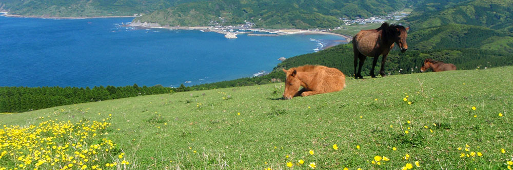 在九州的最南端,有一片被海風輕撫、被陽光洗禮的土地——那是串間市。這裡的海,深邃而青綠;這裡的草原,悠閒地展開在天邊;這裡的馬兒,不屬於人,也不屬於都市,它們只屬於風與海岸線的律動。都井岬的懸崖上,海浪拍打著岩石,海岸植物在鹽霧與陽光中搖曳;幸島那無人居留的小島上,獼猴在海水裡洗涮甘薯,似乎知道時間的節奏與自然的慷慨。